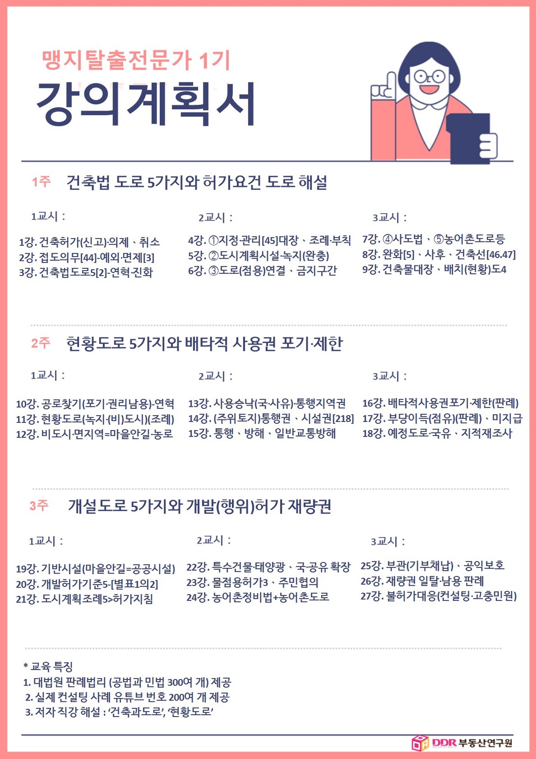 토지가치를 판단하는데 진입로가 첫번째이므로 우선 이 과정을 열심히 공부하시고, 추후 진입로 이외에 개발인허가 공부가 필요한 분은 '토지개발전문가' 강의를 또 공부하여 부동산 최고전문가가 되시기 바랍니다. * 강의시작 : 2월 25일 매주 수요일 19:00~22:00 * 수강료 : 33만원 (농협 351-1154-8084-43 디디알부동산컨설팅) ※ 세금계산서 발행을 원하시면 사업자등록증을 보내주시고, 연락이 없으면 핸드폰 번호로 현금영수증이 발행됩니다. * 교재비 : 2권 5만원 (건축과 도로 개정판, 현황도로 개정판) (농협 457124-52-004451 서영창) * 수강신청서 https://vo.la/DwBGMJf