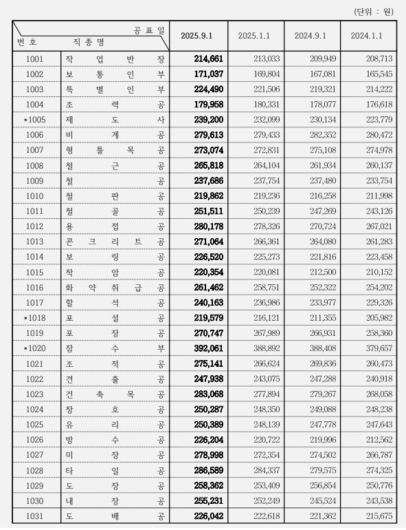 2025년 하반기 적용 건설업 노임단가(2025. 9. 1. ~)