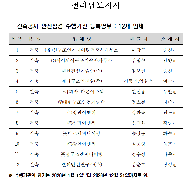 전라남도청에서 추진하는 건축공사의 안전점검 수행기관 등록명부를 다음과 같이 공개합니다.