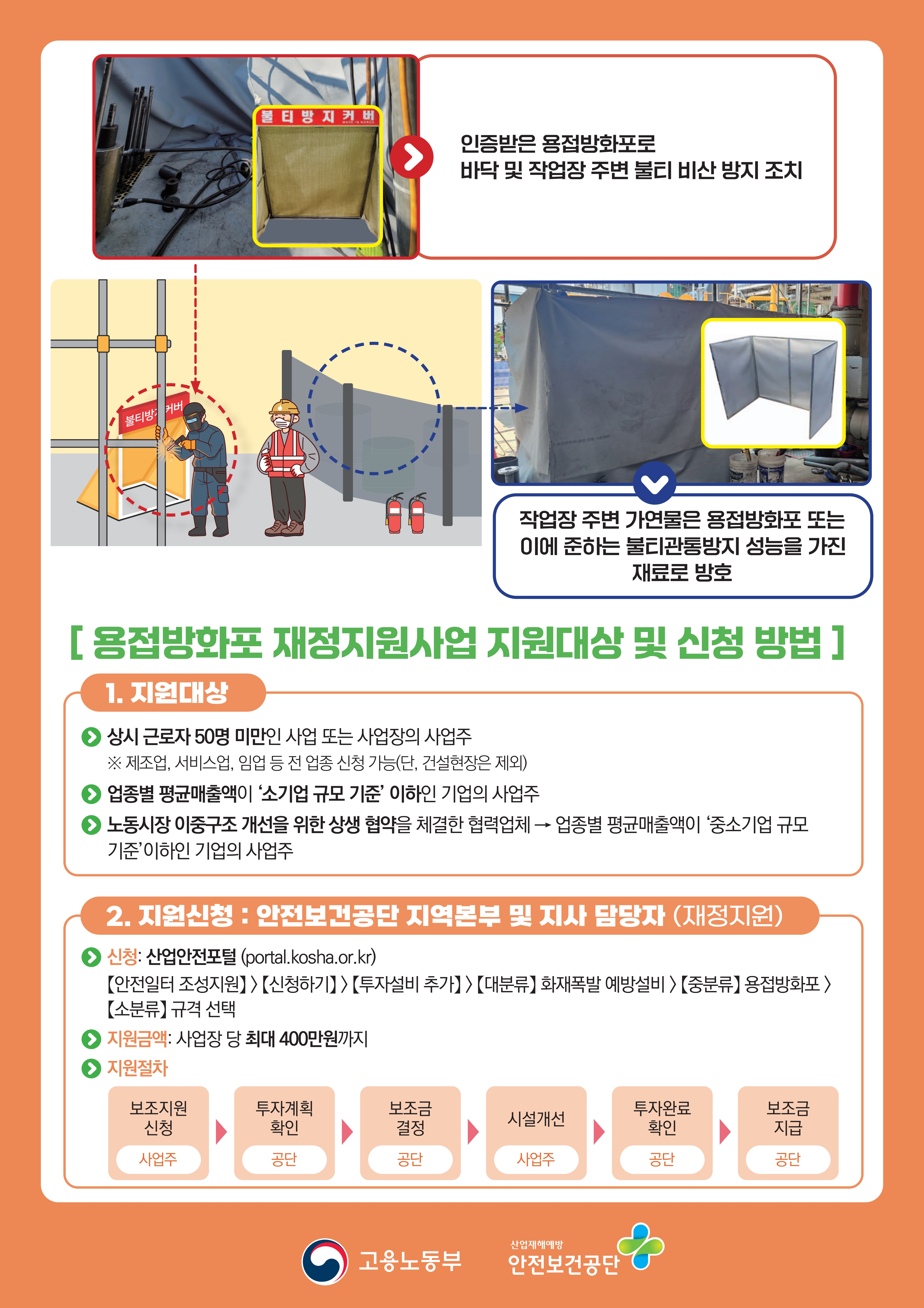 성능인증 받은 용접방화포 사용 의무가 부칙(고용노동부령 제450호)에 따라 '26.3.2.부터 시행될 예정입니다.