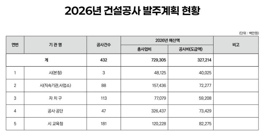 2026년 광주광역시 건설공사 발주계획(1억원 이상 공사)을 알려드립니다.