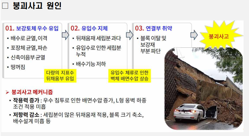 -  (붕괴 원인) 보강토옹벽 상부에 있는 배수로와 포장면의 균열을 통해 보강토옹벽으로 빗물이 지속적으로 유입되어 뒤채움재*가 약화되었고,
